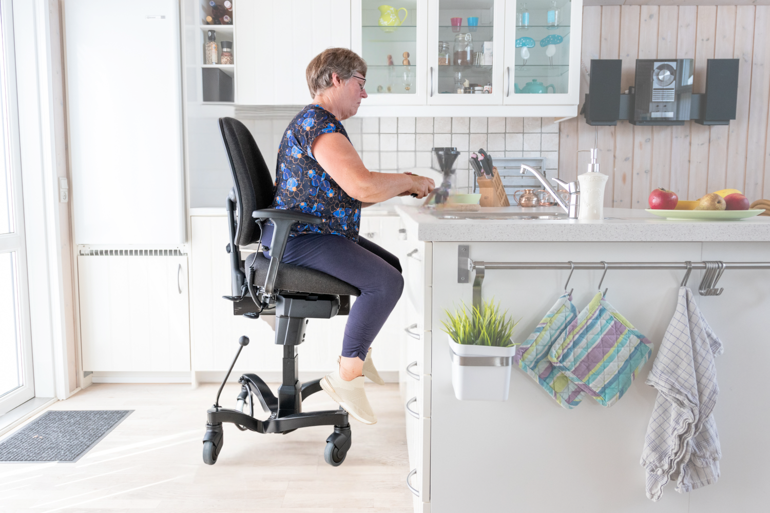 Meine Knie schmerzen, meine Hüfte schmerzt und trotzdem kann ich mich in der Küche bewegen, denn ich habe den VELA Stuhl. Auch wenn ich an den Hängeschrank will, der Vela Stuhl hilft mir dabei die ständigen Schmerzen die ich habe zu mindern. Elektrisch aufrichten, hoch fahren, selbst runterfahren um die Spülmaschine einzurichten, dass alles geht mit einem VELA Stuhl.