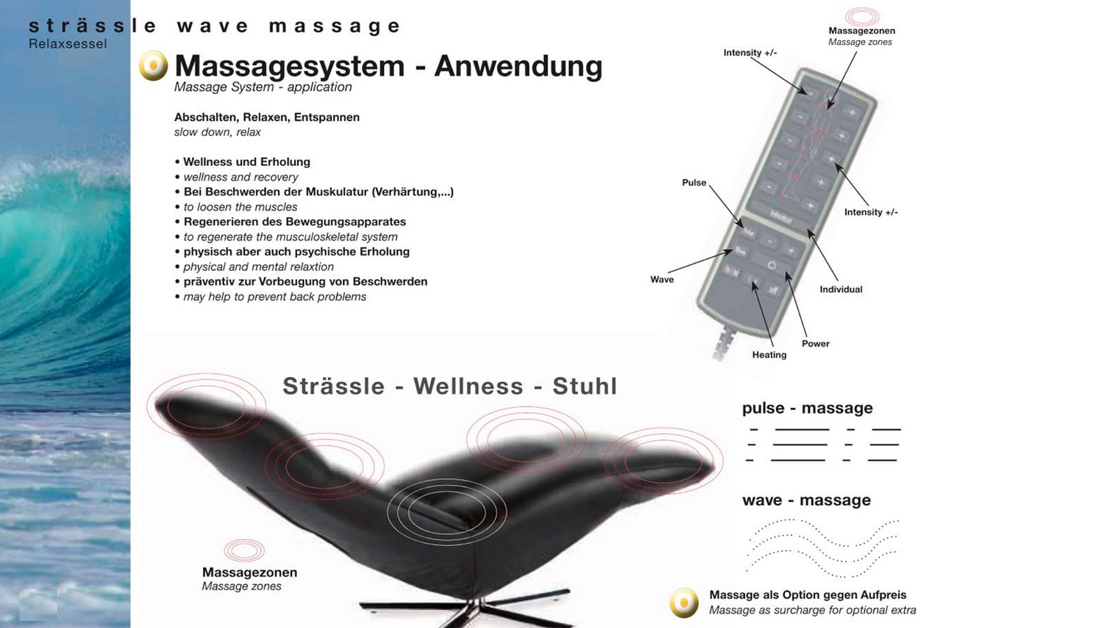 Wer seinem Wohlbefinden etwas Gutes tun möchte, kann den Strässle Sessel mit einer Massagefunktion mit zehn Vibrationsmotoren ausstatten.